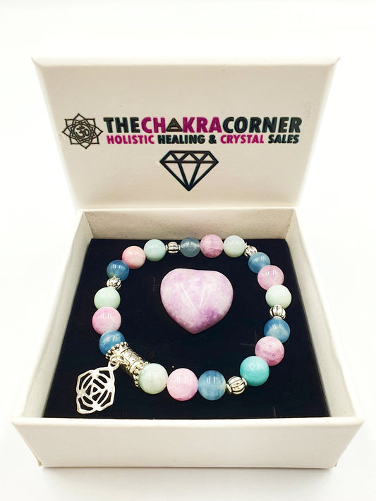Anxiety Support Crystal Healing Bracelet with Chakra Charm (Calcite, Kunzite and Blue Onyx)