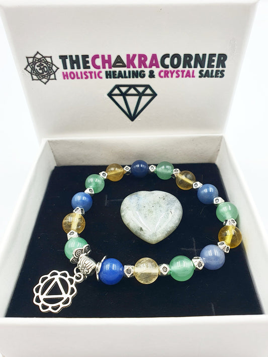 High Cholesterol Support Crystal Healing Bracelet with Chakra Charm (Blue Aventurine, Yellow Fluorite and Green Aventurine)