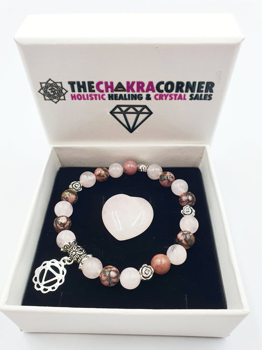 Confidence Support Crystal Healing Bracelet with Chakra Charm (Rhodonite and Rose Quartz)