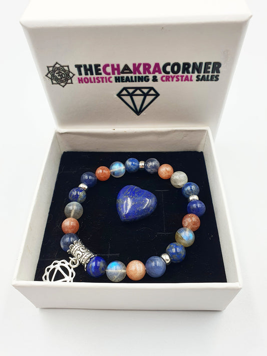 Happiness Booster Support Crystal Healing Bracelet with Chakra Charm (Lapis Lazuli, Sunstone, Sodalite and Labradorite)
