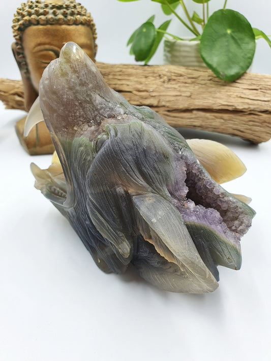 Unique Large Drusy Amethyst Agate Crystal Carved Wolf Head - 1024g