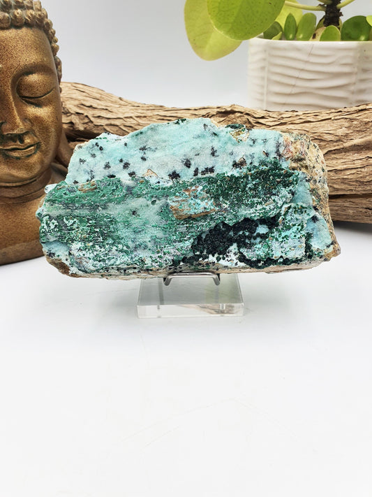 Natural Drusy coated Chryocolla Specimen with Malachite Crystals and Psilomane Dendrite