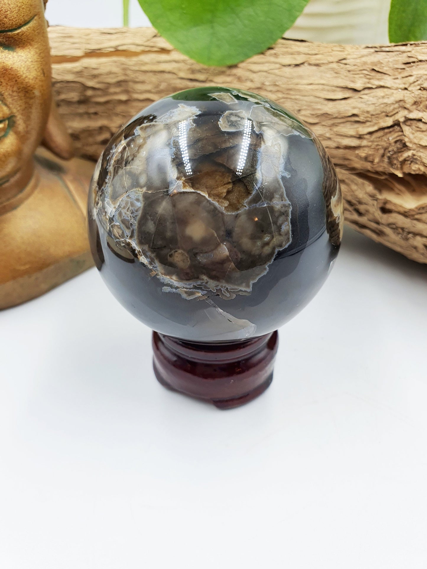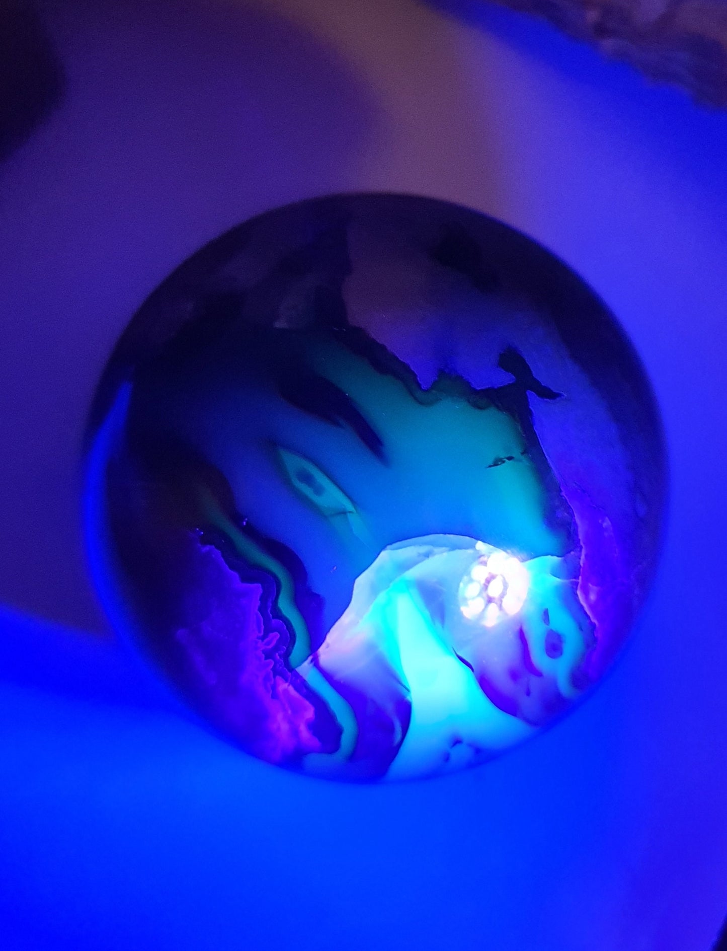 Lovely Volcanic Agate Sphere. This one has so much character with little druzy pocket and bandings around and areas that all light in UV lighting. .